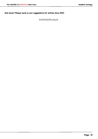 The HISTORY of REDDITCH New Town Redditch Heritage And since? Please send us you suggestions for entries since 2014 Archivist@rlhs.org.uk Page: 13