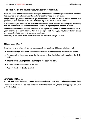 We therefore set out to create a time line of the significant events in Redditch over the last 30