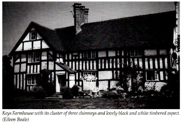 KEYS FARM, with its black and white timbered farmhouse, was probably established for a well-to-do family in the Forest of Feckenham in the seventeenth century. The farmhouse has a spiral staircase which encircles the three great tudor chimneys clustered together in the centre of the building. It has timbered ceilings, walls of wattle and daub, and heavy oak doors with locks. In one of the bedrooms four large cupboards of thick oak, with heavy engraved oak doors with locks, are believed to be safes for the valuables of visitors staying there. There are four attic rooms, two with windows and two without, the latter having hard plaster floors, used probably for the storage of cheese. One of the dark attics has a trap door in the floor, giving access to a deep cavity which has a base floor some five feet above the ground floor level. Within this cavity there have been found clay pipes, old dipped matches, an old hand-made boot and much else, suggesting that it may have been used as a catholic priest's hiding place.