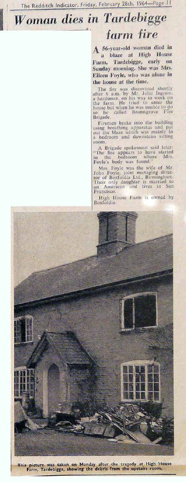 HIGH HOUSE FARM, in High House Lane, was, in the mid nineteenth century, in the hands of William Bradley, a Tardebigge church- warden in the 1840s. Following the 1946 sale of the Hewell Estates the property was owned by John Coney and he sold it in 1951 to Boxfoldia Ltd, one of whose joint managers, John Foyle, came and lived at the farm with his wife Eileen. Unfortunately in 1964 there was a fire there in which Eileen, who was alone in the house at the time, died. For many years the farm, owned by Boxfoldia, was managed by Heinrich Siodlioteck (known as Heinz) who had been a prisoner of war, together with his English wife Doreen and son Peter. Latterly the farmhouse has been a private dwelling, with adjacent barn conversions.
