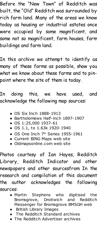 There is still a great deal of research still to do to progress this archive. If you have any data or photographs of Old Redditch Farms or would like to help us research the topic, please get in touch.