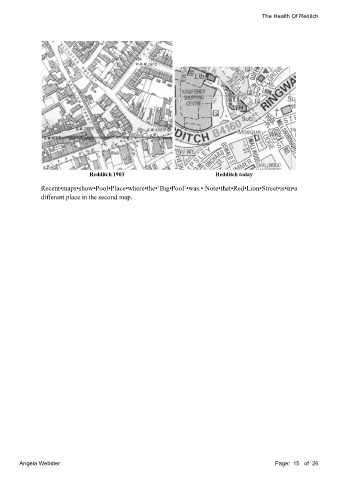 The Health Of Reditch Redditch 1903 Redditch today Recent•maps•show•Pool•Place•where•the•‘Big•Pool’•was.• Note•that•Red•Lion•Street•is•in•a different place in the second map. Angela Webster Page: 15 of 26