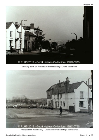 Prospect Hill Looking north on Prospect Hill (West Side) - Crown Inn far left Prospect Hill (West Side) - Crown Inn other buildings demolished Compiled by Redditch Library Volunteers Page: 13 of 18