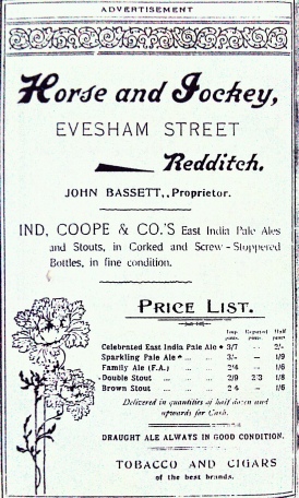 Evesham Street was full of pubs. According to Old Redditch Pubs in this short road were The Butler's Beerhouse, The Printer's Arms, The Horse and Jockey The Vine Inn (later The Talbot, The White Swan, The Pointer's (later The Royal George), The Turf, The Fleece, The Fountain Inn, The Hungry Man, The Old Briton, The Golden Salmon and The Plough and Harrow.