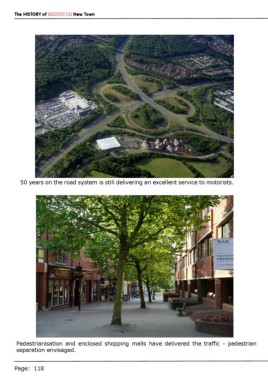 The HISTORY of REDDITCH New Town 50 years on the road system is still delivering an excellent service to motorists. Pedestrianisation and enclosed shopping malls have delivered the traffic - pedestrian separation envisaged. Page: 118