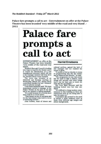 th The Redditch Standard - Friday 25 March 2011 Palace fare prompts a call to act – Entertainment on offer at the Palace Theatre has been branded ‘very middle of the road and very bland’. - 2011 101