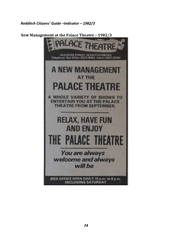 Redditch Citizens’ Guide –Indicator – 1982/3 New Management at the Palace Theatre – 1982/3 74