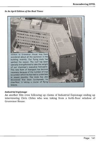 Remembering ISTEL In An April Edition of the Real Times Industrial Espionage An another film crew following up claims of Industrial Espionage ending up interviewing Chris Chiles who was taking from a forth-floor window of Grosvenor House. Page: 141