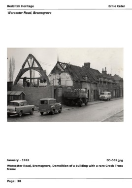 Redditch Heritageedditch Heritage E R Ernie Caterrnie Cater Worcester Road, Bromsgrove January - 1962 EC-065.jpg Worcester Road, Bromsgrove, Demolition of a building with a rare Crock Truss frame Page: 38age: 38 P