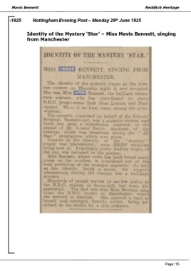 Mavis Bennett Redditch Heritage th -1925 Nottingham Evening Post – Monday 29 June 1925 Identity of the Mystery ‘Star’ – Miss Mavis Bennett, singing from Manchester Page: 15