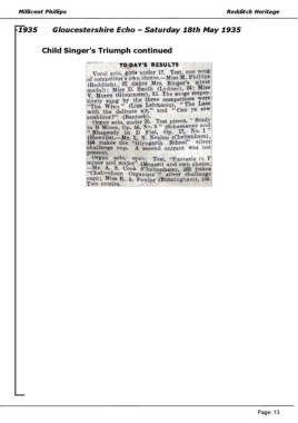 Millicent Phillips Redditch Heritage -1935 Gloucestershire Echo – Saturday 18th May 1935 Child Singer’s Triumph continued Page: 13