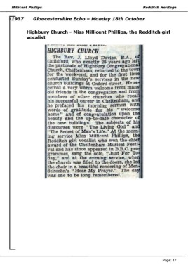 Millicent Phillips Redditch Heritage -1937 Gloucestershire Echo – Monday 18th October Highbury Church - Miss Millicent Phillips, the Redditch girl vocalist Page: 17