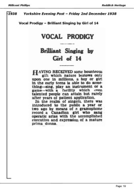 Millicent Phillips Redditch Heritage -1938 Yorkshire Evening Post – Friday 2nd December 1938 Vocal Prodigy – Brilliant Singing by Girl of 14 Page: 19