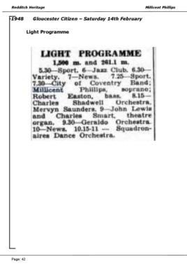 Redditch Heritage Millicent Phillips -1948 Gloucester Citizen – Saturday 14th February Light Programme Page: 42