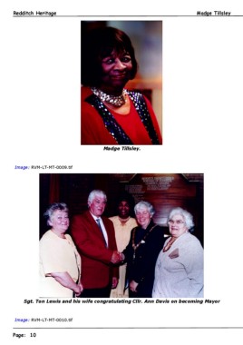 Redditch Heritage Madge Tillsley Madge Tillsley. Image: RVM-LT-MT-0009.tif Sgt. Ton Lewis and his wife congratulating Cllr. Ann Davis on becoming Mayor Image: RVM-LT-MT-0010.tif Page: 10