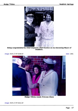 Madge Tillsley Redditch Heritage Being congratulated by Chief Inspector Phill Purslow on my becoming Mayor of Redditch. Image: RVM-LT-MT-0048.tif Date: 1991 Madge Tillsley meets Princess Diana Image: RVM-LT-MT-0022.tif Page: 17