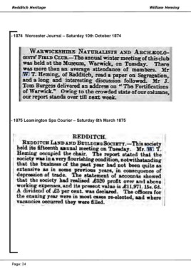 Redditch Heritage William Heming - 1874 Worcester Journal – Saturday 10th October 1874 - 1875 Leamington Spa Courier – Saturday 6th March 1875 Page: 24
