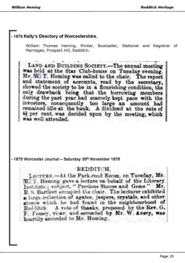 William Heming Redditch Heritage - 1876 Kelly’s Directory of Worcestershire, William Thomas Heming, Printer, Bookseller, Stationer and Registrar of Marriages, Prospect Hill, Redditch. th - 1875 Worcester Journal – Saturday 30 November 1878 Page: 25