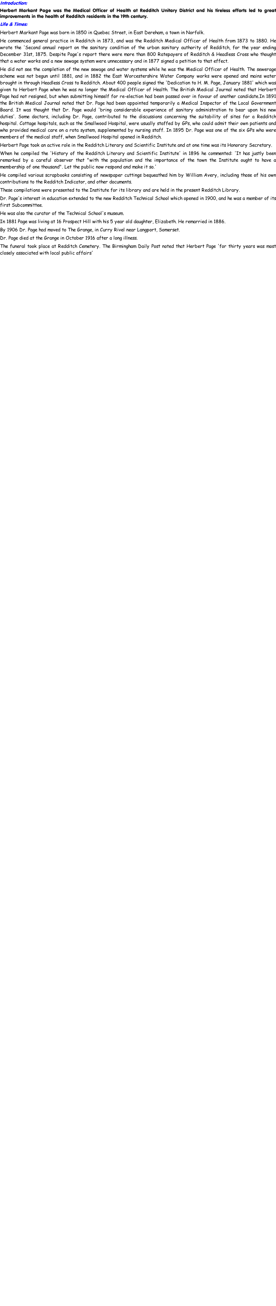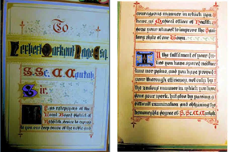 This 'Dedication (image courtesy Redditch Library) to H. M. Page, January 1881' was given to Herbert Page when he was no longer the Medical Officer of Health: