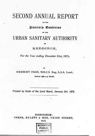 Cover page of the 'Second annual report on the sanitary condition of the urban sanitary authority of Redditch, for the year ending December 31st, 1875.’ (Source: Redditch Library)