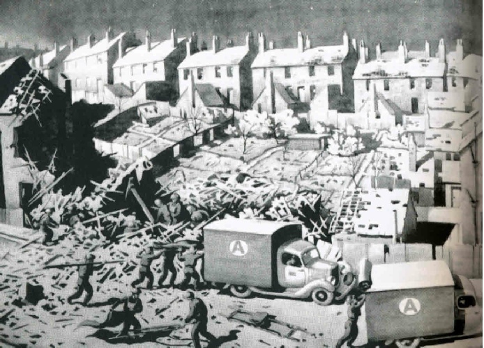 Drawing by Norman Neasom of the effect of the wartime bomb which fell on Glover Street in 1939