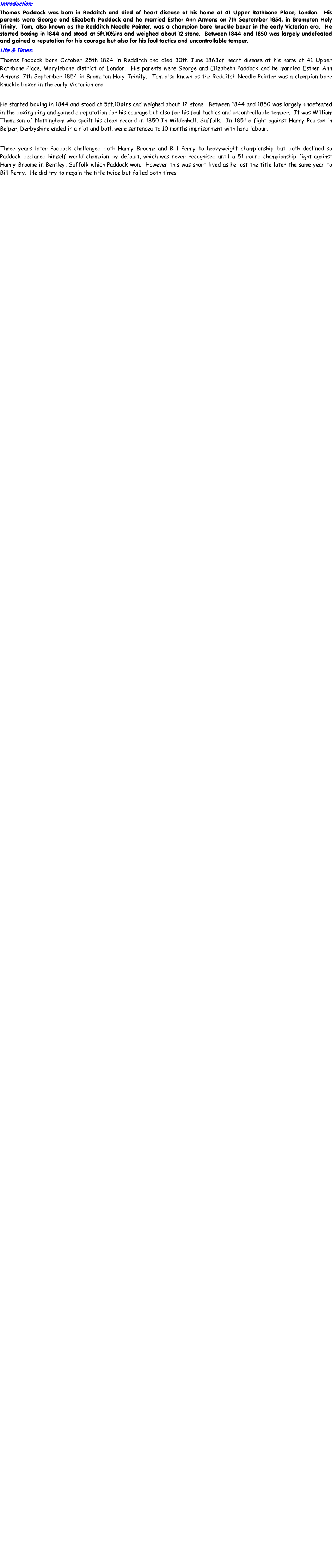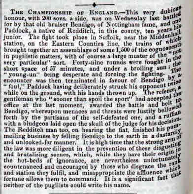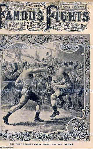 Famous fights newspaper – 4th March 1901–1904 covered the history of bareknuckle boxing. On the cover was the fight between Harry Broome and Tom Paddock in 1856, which Paddock won.