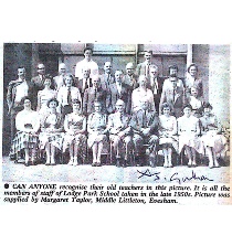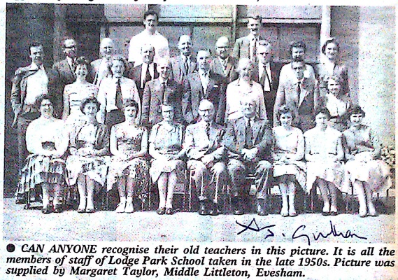 Can anyone recognise their old teachers in this picture. It is all the members of staff of Lodge Park School taken in the late 1950’s?