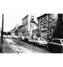 NextBackThis view of the Southern Pavement illustrates some of the industry located in Queen Street. It also shows, at the far end on the right, some of the residential buildings which were known as Margaret Place – different from so many houses of the area – for they were not associated with a ‘yard.’