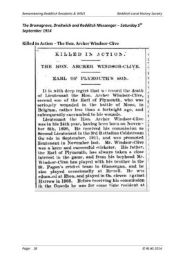 Remembering Redditch Residents & WW1 Redditch Local History Society th The Bromsgrove, Droitwich and Redditch Messenger – Saturday 5 September 1914 Killed in Action – The Hon. Archer Windsor-Clive Page: 18 © RLHS 2014