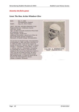 Remembering Redditch Residents & WW1 Redditch Local History Society Ancestry site find a grave Lieut. The Hon. Archer Windsor-Clive Page: 20 © RLHS 2014