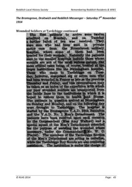 Redditch Local History Society Remembering Redditch Residents & WW1 th The Bromsgrove, Droitwich and Redditch Messenger – Saturday 7 November 1914 Wounded Soldiers at Tardebigge continued © RLHS 2014 Page: 45