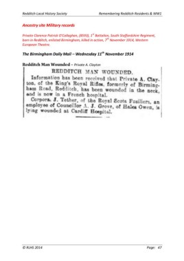 Redditch Local History Society Remembering Redditch Residents & WW1