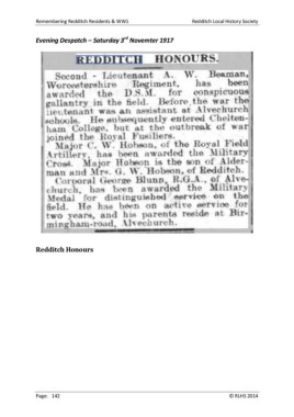 Remembering Redditch Residents & WW1 Redditch Local History Society rd Evening Despatch – Saturday 3 Novemter 1917 Redditch Honours Page: 142 © RLHS 2014
