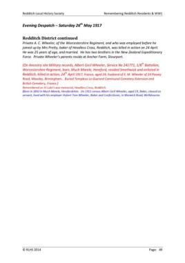 Redditch Local History Society Remembering Redditch Residents & WW1