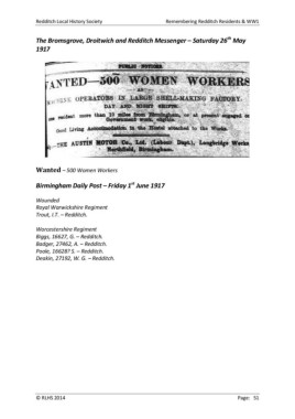 Redditch Local History Society Remembering Redditch Residents & WW1