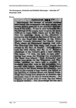 Remembering Redditch Residents & WW1 Redditch Local History Society th The Bromsgrove, Droitwich and Redditch Messenger – Saturday 16 November 1918 Peace Page: 114 © RLHS 2014
