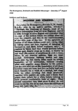Redditch Local History Society Remembering Redditch Residents & WW1 th The Bromsgrove, Droitwich and Redditch Messenger – Saturday 17 August 1918 Soldiers and Strikers © RLHS 2014 Page: 83
