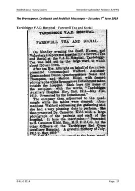 Redditch Local History Society Remembering Redditch Residents & WW1 th The Bromsgrove, Droitwich and Redditch Messenger – Saturday 7 June 1919 Tardebigge V.A.D. Hospital – Farewell Tea and Social © RLHS 2014 Page: 27