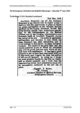 Remembering Redditch Residents & WW1 Redditch Local History Society th The Bromsgrove, Droitwich and Redditch Messenger – Saturday 7 June 1919 Tardebigge V.A.D. Hospital continued Page: 30 © RLHS 2014