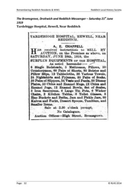 Remembering Redditch Residents & WW1 Redditch Local History Society st The Bromsgrove, Droitwich and Redditch Messenger – Saturday 21 June 1919 Tardebigge Hospital, Hewell, Near Redditch Page: 32 © RLHS 2014