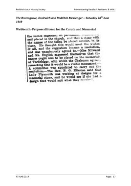 Redditch Local History Society Remembering Redditch Residents & WW1 th The Bromsgrove, Droitwich and Redditch Messenger – Saturday 28 June 1919 Webheath- Proposed House for the Curate and Memorial © RLHS 2014 Page: 37