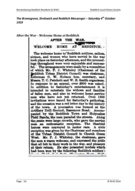 Remembering Redditch Residents & WW1 Redditch Local History Society th The Bromsgrove, Droitwich and Redditch Messenger – Saturday 4 October 1919 After the War – Welcome Home at Redditch Page: 54 © RLHS 2014