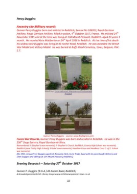 Forces War Records, Gunner Percy Duggins was born and resided in Redditch. He was in the